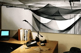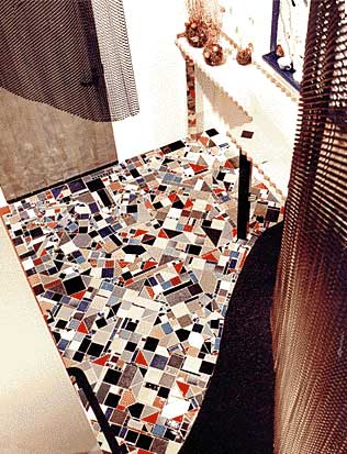 Being an interior design studio there were lots of individual ceramic tiles in the sample library…thus a floor is born. With no pattern in mind this 40 square feet of rambling mosaic sets the flavor at the point of entry. Large swaths of colored metal mesh screen become sails to highlight the two-story high ceiling. Recycled ‘wiggle board’, the kind used to ship corrugated glass panels, becomes an entry counter used for the display of revolving artist’s work.